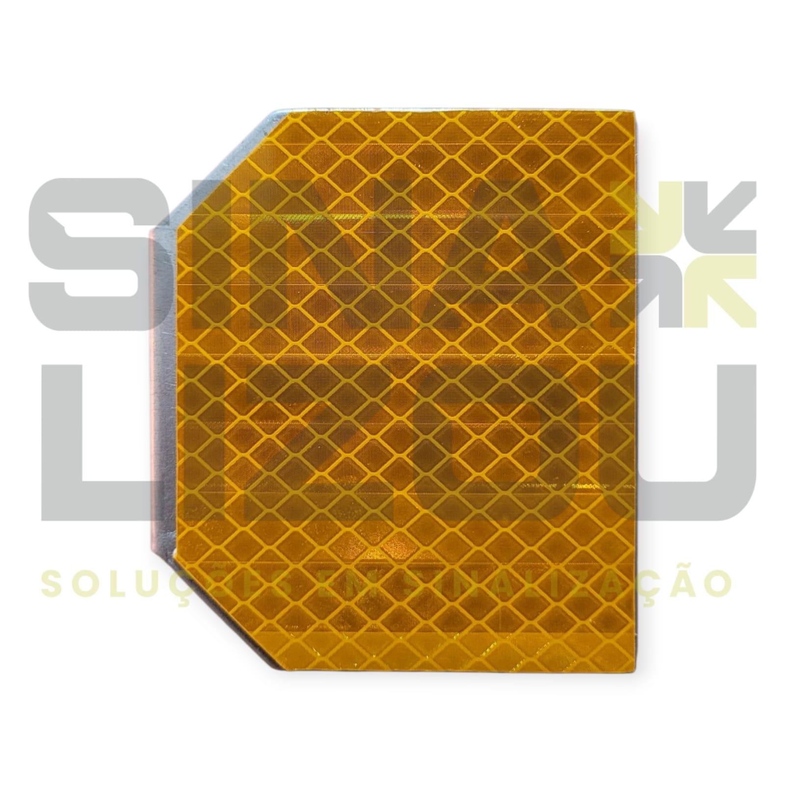 Catadióptrico produzido para uso em defensa metálica, fabricado em chapa de aço galvanizado #18, garantindo resistência mecânica superior e longa vida útil em ambientes externos. Aplicado com adesivo prismático de alta intensidade (Tipo III), proporciona excelente retrorrefletividade mesmo sob chuva, neblina ou pouca iluminação.