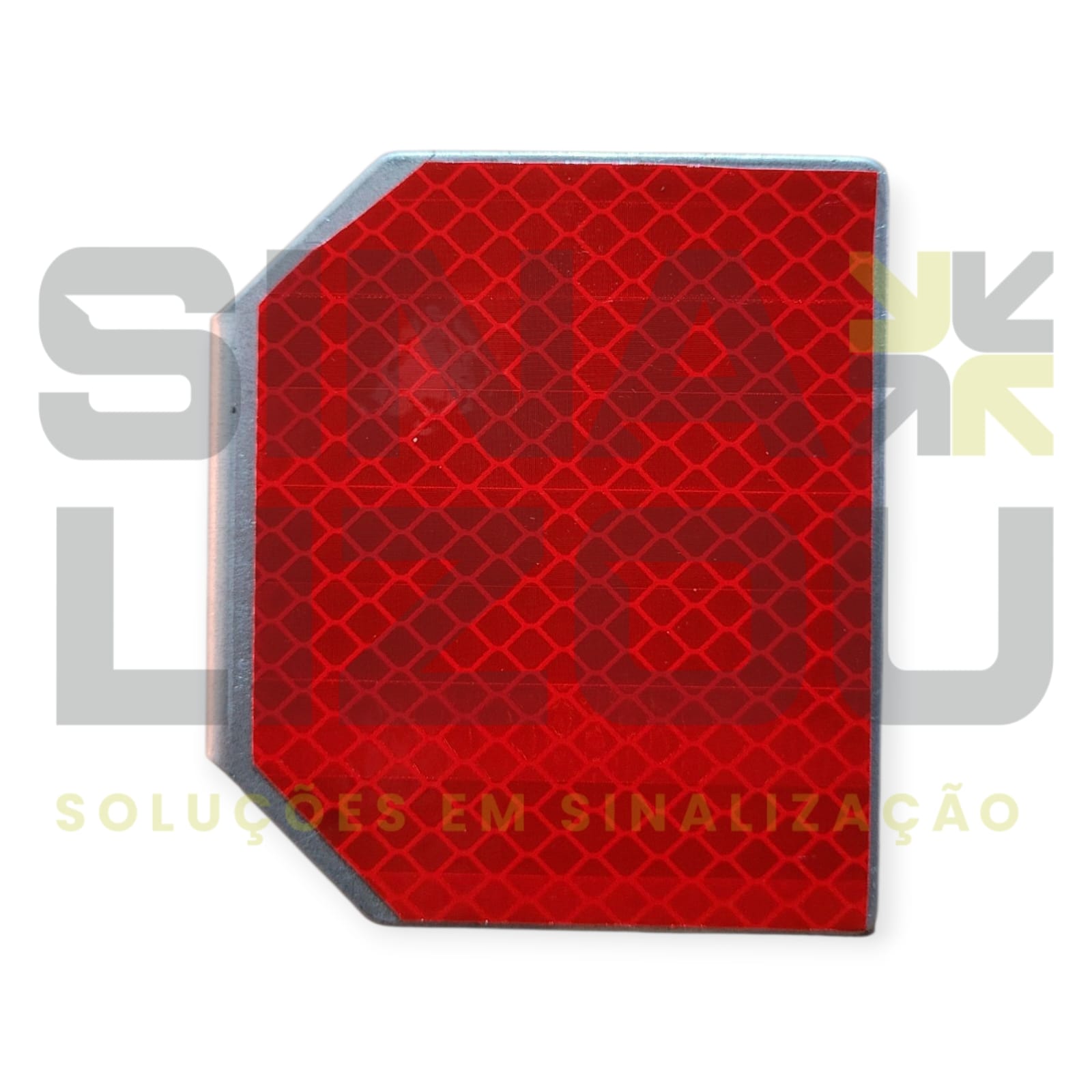 Catadióptrico produzido para uso em defensa metálica, fabricado em chapa de aço galvanizado #18, garantindo resistência mecânica superior e longa vida útil em ambientes externos. Aplicado com adesivo prismático de alta intensidade (Tipo III), proporciona excelente retrorrefletividade mesmo sob chuva, neblina ou pouca iluminação.